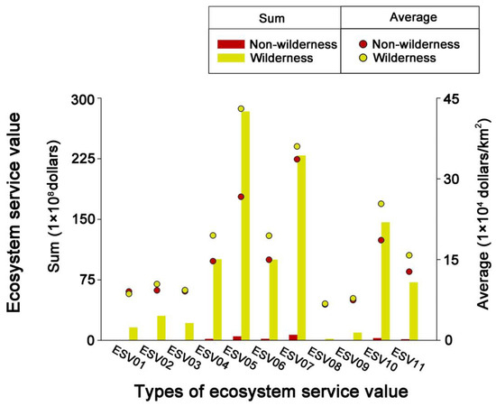 ESVs of WAs and non-WAs. The dataset of ESVs includes 11 ecosystem service values subcategories including food supply (ESV01), raw material supply (ESV02), water supply (ESV03), gas regulation (ESV04), climate regulation (ESV05), environmental purification (ESV06), regulation of water flows (ESV07), soil conservation (ESV08), maintenance of nutrient cycles (ESV09), maintenance of biodiversity (ESV10), and aesthetic landscape experiences (ESV11).