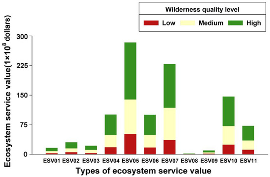 Area of WAs of different wilderness quality levels with different ecosystem service value levels.