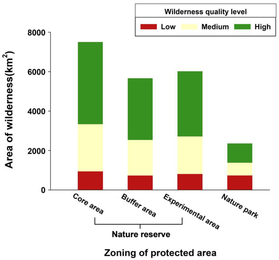 The percentage of area of WAs in the core, buffer, and experimental zones of nature reserves is 95.49%, 94.84%, and 86.53%, and the area of WAs in nature parks constitutes 91.91%. High-quality WAs in the core, buffer, and experimental zones of the nature reserves and in the nature parks comprise 55.54%, 55.15%, 54.96%, and 41.35% of the area of WAs in each subregion (Figure 6).