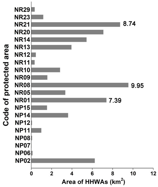 HHWAs are scattered across the study area, of which 47.74% are distributed within the boundaries of 21 PAs. NR08, NR21, and NR01 protect the largest areas of HHWAs, covering 9.55 km2, 8.74 km2, and 7.39 km2, respectively (Figure 7). Unprotected HHWAs are mainly located around NR01, NR09, and NR12 (Figure 8).