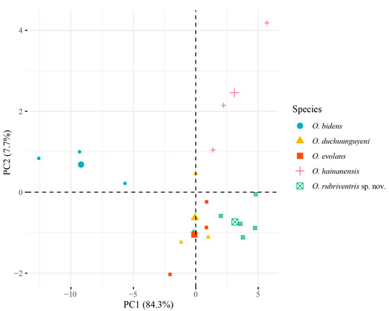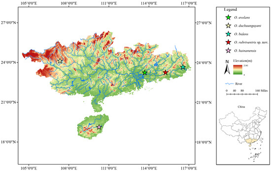 | O. rubriventris sp. nov. | O. evolans | O. duchuunguyeni | O. bidens | O. hainanensis | |||||||||||||||||||||||||||