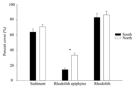 Cover of sediment, rhodolith epiphytes, and rhodolith (Lithothamnion glaciale) calculated from photographs of the bed at the South and North sites. The asterisk denotes a statistically significant difference between mean values for the “Rhodolith epiphytes” category.