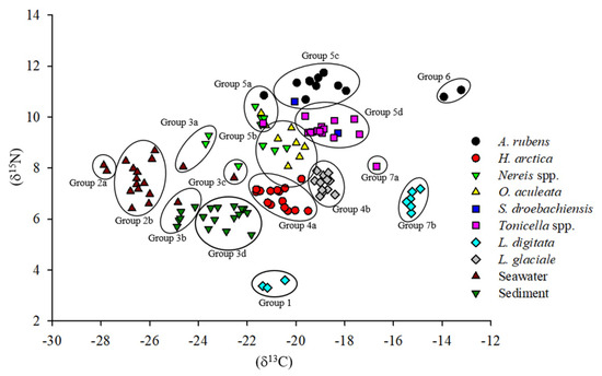 Groups 4 and 7 each had two distinct subgroups of monospecific components: H. arctica (Group 4a), L. glaciale (Group 4b), Tonicella spp. (Group 7a), and L. digitata (Group 7b) (Figure 4 and Table 4).