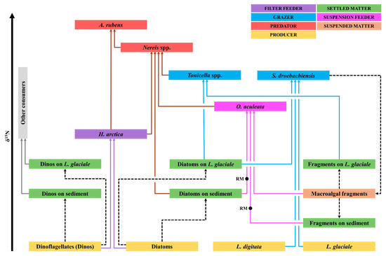 Based on our findings and on Hacker Teper et al. [30], we hypothesize that a resource-partitioning relationship may exist where multiple species utilize different forms of the same food (i.e., algae/kelp and particulate algae/kelp) through various feeding strategies (i.e., suspension feeding and grazing), where the organisms benefit from the residual food from their co-habitants (Figure 5). Accordingly, because suspension-feeding O. aculeata and grazing Tonicella spp. likely cannot utilize large pieces of drift kelp, they could potentially utilize residual feeding matter in the form of particulate kelp after S. droebachiensis or other larger organisms have grazed on it and broken it down [86,87]. Simultaneously, the complex physical structure of rhodoliths might trap algal particulates that subsequently become more enriched through microbial activity, resulting in increased nutritive value through increased nitrogen content [88,89]. Nereis spp. may not require large amounts of DHA [90], and, given the similarity between its fatty acid profile and that of O. aculeata and Tonicella spp., it likely receives ARA by preying or scavenging on organisms in the rhodolith community rather than feeding directly on a kelp source. However, depending on the specific Nereis species and population, we propose at least three different foraging strategies. Nereis spp. could: (1) prey on rhodolith biota [91]; (2) consume detrital and microbenthic algae in the uppermost portion of the sediment layer on which the rhodoliths sit [92]; and (3) filter feed on phytoplankton [93]. Some populations may also switch from one mode to another [92]. In fact, N. diversicolor can change its feeding strategy from predatory to suspension feeding [93], whereas juvenile N. virens feed on detritus [94] and plant matter, which promotes growth [95]. Regardless, the diverse fatty acid assemblage of Nereis spp. suggests that small, likely juvenile, individuals feed on a combination of prey, detritus, and phytoplankton.