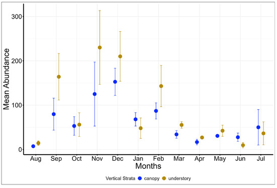 In total, we captured 5303 individuals, distributed across 46 butterfly species, from four subfamilies (Table S1). The most representative subfamily was Biblidinae and the three most abundant species, Eunica tatila, Callicore astarte, and Eunica maja, belonged to this subfamily. The most abundant species, E. tatila, represented about 75% of the total abundance in the assemblages (N = 3972), being dominant in both vertical strata. However, understory assemblages had higher butterfly abundance (N = 3121) than canopy assemblages (N = 2182). The GLMM analysis revealed a significant effect of the vertical strata in terms of the abundance distribution and detected variations in the abundance between different months (Table 1; Figure 2). The hot season months had higher abundance than the milder months and, in some cases, the abundance did not differ between the vertical strata within the sampled month (Figure 2).