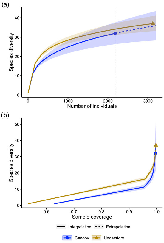 (a) Individual-based rarefaction curves comparing the species richness of fruit-feeding butterfly assemblages between the canopy and understory. The dashed line represents the interpolation where the number of individuals is the same for both vertical strata. The blue dashed line is the extrapolated number of individuals for the canopy. (b) Coverage-based curves comparing the species richness between the canopy and understory.