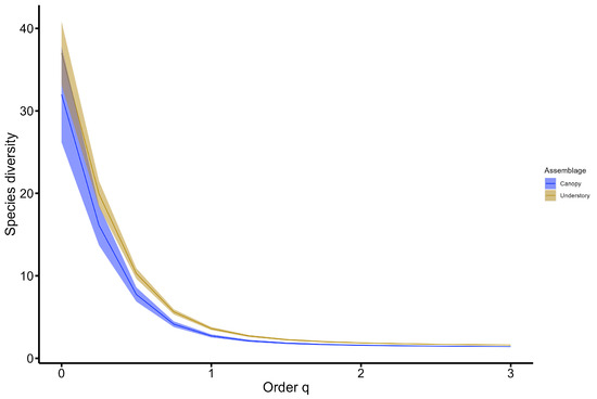 To test whether the species richness differed among the vertical strata, we calculated interpolation and extrapolation curves (with 999 bootstrap resampling), based on the number of individuals and the sample coverage [30,31]. The combined use of these approaches allows more robust inferences and guarantees sampling quality in comparisons with the species richness [32]. We also performed diversity profile curves, using Hill numbers to test the differences in diversity between the understory and canopy. The order of diversity indicates its sensitivity in regard to common and rare species; the most common species are favored as the q-value increases, then for values less than unity (q < 1), the diversity profile gives more weight to the rare species [33]. Orders of diversity (q values) are analogous to species richness (q = 0), the Shannon index (q = 1), and Simpson’s index (q = 2). Interpolation/extrapolation rarefactions and diversity profiles were calculated using the iNEXT package [31].