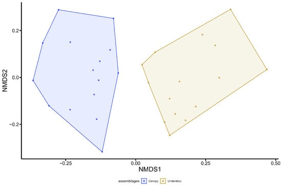 Non-metric multidimensional scaling (NMDS) demonstrating the difference in species composition between the canopy (circles) and understory (triangles).