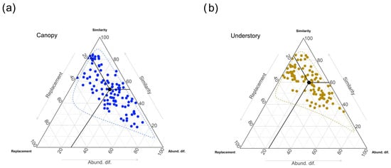SDR simplex approach for spatial beta diversity within each vertical stratum obtained through the Ruzicka dissimilarity matrix. Black lines inside each triangle represent the mean values for each component and the black points are the mean values for all the three components. Dashed lines represent the confidence intervals (0.95). (a) SDR simplex for pairwise canopy traps; (b) SDR simplex for pairwise understory traps.