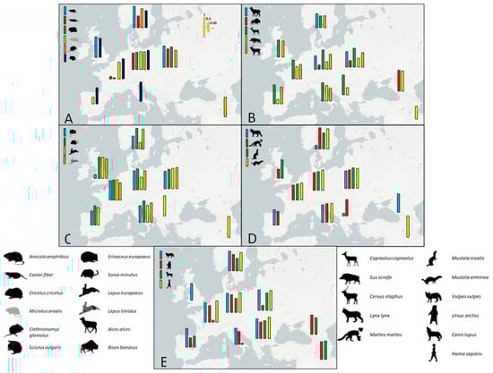 Maps displaying the contemporary D-loop haplotype diversities for each species among ten predefined geographic regions. (A) Rodentia, (B) Artiodactyla, (C) Lagomorpha and Eulipotyphla, (D) Carnivora (Felidae, Mustelidae), and (E) Carnivora (Canidae, Ursidae) and Primates. The contemporary human haplotype diversity shown is that during the Mesolithic and not modern times.