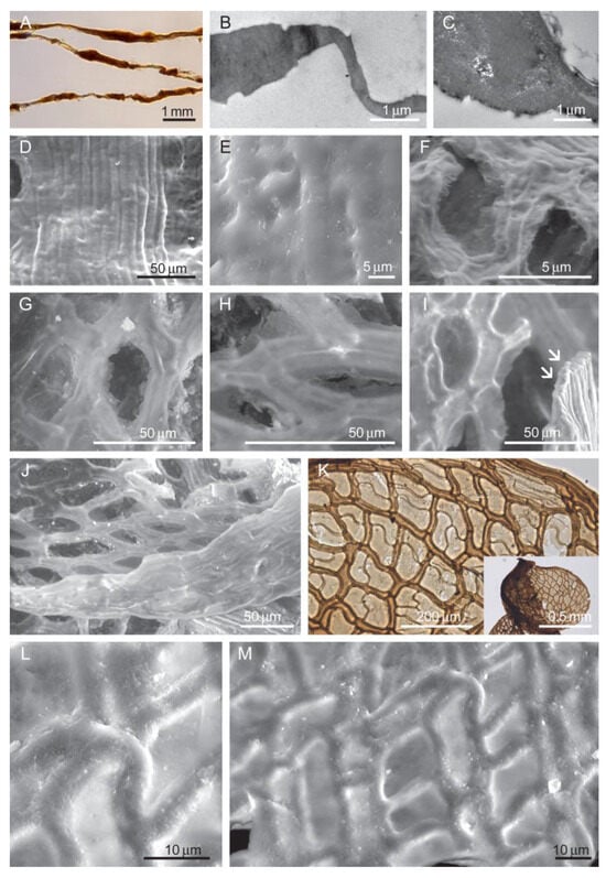 Protosphagnum nervatum. (A–C) Araldite-embedded leaf transverse sections, 2 μm thick, under LM (A) and 60 nm thick under TEM (B–C), showing the homogeneous structure of the fossil; (D,E) costa surface; (D–J,L,M) SEM images of leaves, showing dimorphic cells with very thin walls of the hyalocysts (F–J,L,M), partly broken (G,H,J) or mostly retained (I,L,M); (K) juvenile leaf (shown in whole in inset) areolation, LM image, showing the delicate nature of the hyalocyst cell walls. Unistratose part of costa is seen in (I) (arrowed). Aristovo, Permian (Lopingian): (A) CUT_S5_3_37, (B–C) CUT_TEM_5, (D–J,L,M) CUT_SEM_1, and (K) 100B-2.