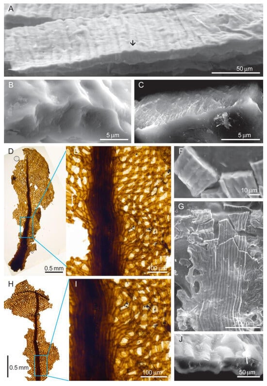 Protosphagnum nervatum. (A,B) Transverse costa sections, SEM images, of leaf shown in (D,E), LM images; (C,F–J) transverse costa sections, SEM images, of leaf shown in (H,I), LM images. Note the unistratose costa, in which cells look to be filled with spongy material (C,F), likely an effect of fossilization. Aristovo, Permian (Lopingian): (A,B,D,E) CUT_SEM_2, and (C,F–J) CUT_SEM_3.
