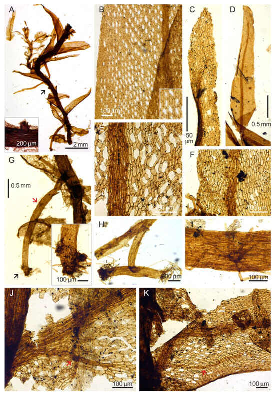 Rhizinigerites neuburgae. (A, with close up of rhizoidophore in G) habit, showing the branched stem with leaves and rhizoidophore; the A-inset shows the branch bud (where the arrow points) that has no foliate structure on the stem around it; the G-inset shows the end of the rhizoidophore with rhizoid clusters. (B) A leaf fragment showing areolation with some of the cells missing and no marginal border; the inset highlights the protosphagnalean areolation pattern. (C,D) The leaf apical parts and areolation in different parts of the leaves. (E,F) The laminal cells, showing the areolation variation. (H) A part of the rhizoidophore separated by places with abundant rhizoids. (I) A rhizoid cluster on the rhizoidophore. (J,K) Lower leaf parts showing the unistratose veins of long cells, diverging from the main costa (red arrows). Viled, Permian (Lopingian). See details of the locality in [,]. (A–C,E,F,H–K) GIN 3774/3B-10-1, (D) GIN 3774/3B-10-2, and (G) GIN 3774/3B-5-9.