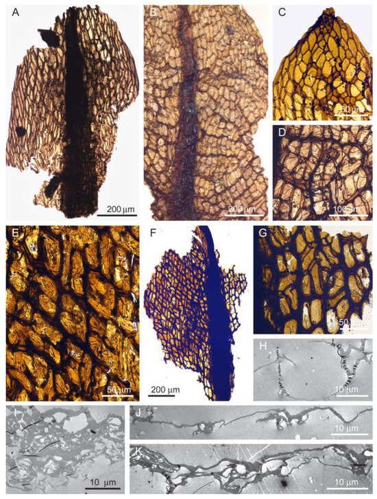 Palaeosphagnum meyenii. (A–D) Leaf fragments and details of areolation. (E–G) Leaf fragment used for sectioning, shown in (H–K). (H–K) Transverse sections of leaf fragment F, which is 60 nm thick, TEM, showing a unistratose lamina with partly inflated cells (H,J). Multistratose costa (I), and bistratose area flanking the costa (K). Aristovo, Permian (Lopingian), (A) 124B-13, (B) 105B-8, (C) 125A-1, (D) 105B-8, and (E–K) CUT_TEM_P9.