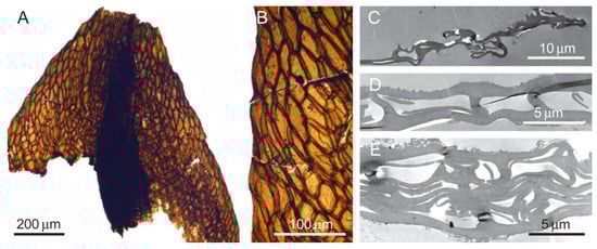 Servicktia undulata. (A,B) Leaf fragment and the cells of its border. (C–E) Its transverse sections, showing a rough cell surface due to irregular papillae and probably prorate cell ends (C), unistratose lamina (D), and multistratose costa (E). Aristovo, Permian (Wushiapingian), (A–E) CUT_TEM_P11.