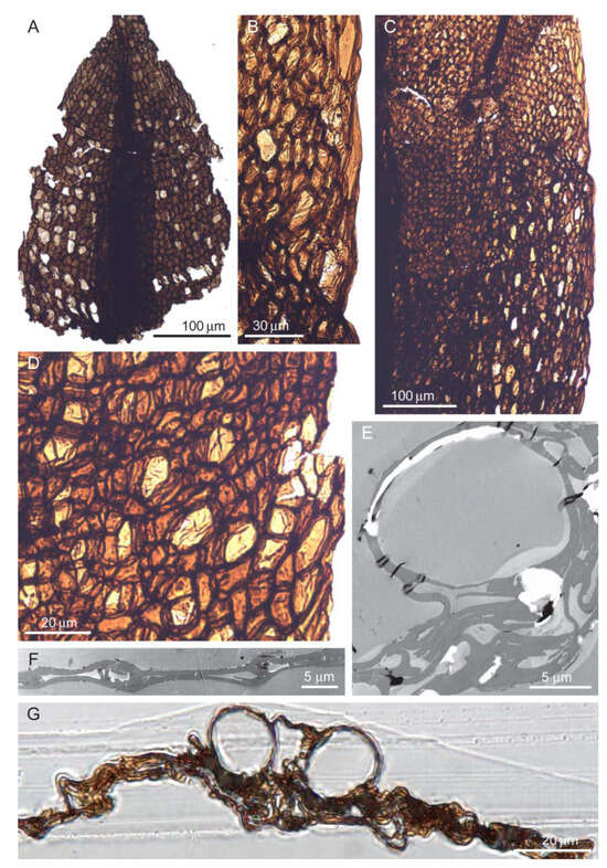 Servicktia vorcutannularioides. (A–D) Leaf fragments and details of dimorphic cell areolation. (E–G) Transverse sections under TEM (E,F) and LM (G), showing multistratose costa (E,G), unistratose lamina (F), and inflated cells on ventral side of costa (E, G). Aristovo, Permian (Lopingian), (A) 107A-2, (B) 106A-5, (C) 106A-5, (D) 106A-10, and (E–G) CUT_TEM_P6.