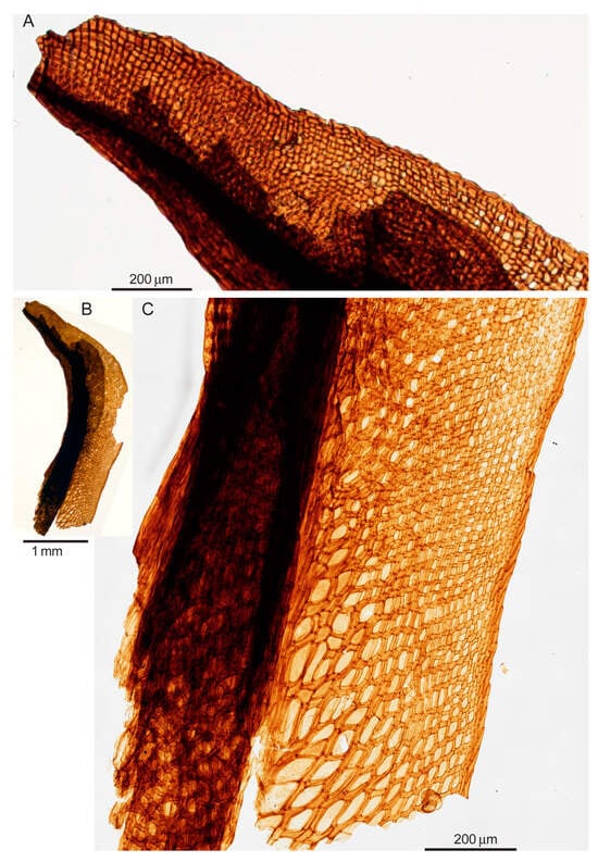 To accommodate these intermediate morphs across the numerous studied localities in NE European Russia, the genus Syrjagia Fefilova was described with a Protosphagnum-like leaf structure in its proximal part, while distally it is indistinguishable from Intia [,]. However, further studies [,,] have shown that the co-occurrence of protosphagnalean and bryoid areolation within a single leaf is even more common, posing a challenge for formal classification. This phenomenon has been discussed in terms of cell divisions [], showing that the irregular development of cell T-triads, TT-tetrads, or TTT-pentads [] results in the protosphagnalean areolation pattern appearing in different parts of leaves without obvious rules (Figure 1C,E).