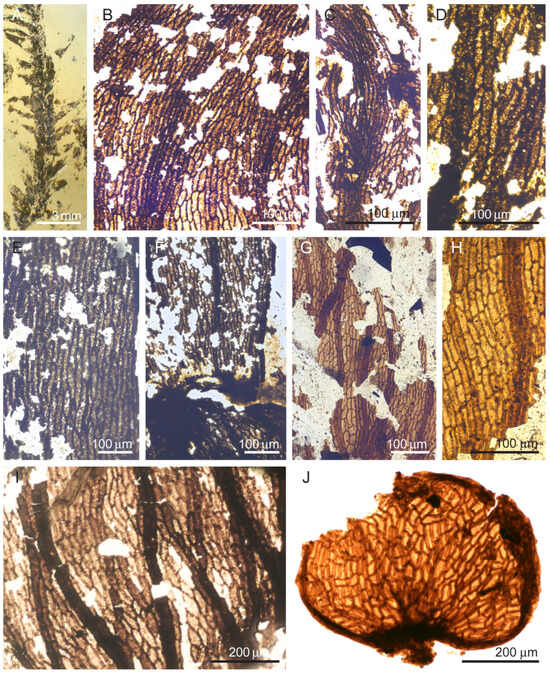 Protosphagnalean mosses showing typical dimorphic areolation pattern for Protosphagnum (H,I), mostly monomorphic for Intia (B,D,F,J) and Kosjunia (G), and combining mono and dimorphic areolation types in different parts of leaves (A,C,E,H). (A) Stem with leaves, (B) young leaves crowded at stem tip, and (C–J) leaf fragments. Aristovo, Permian (Lopingian): (A) 126A-3A, (B) 49B-5, (C) 16B-6, (D) 39B-7, (E) 100A-9, (F) 44A-1, (G) 47B-9, (H) 31A-3, (I) 38A-6, and (J) 43B-9.