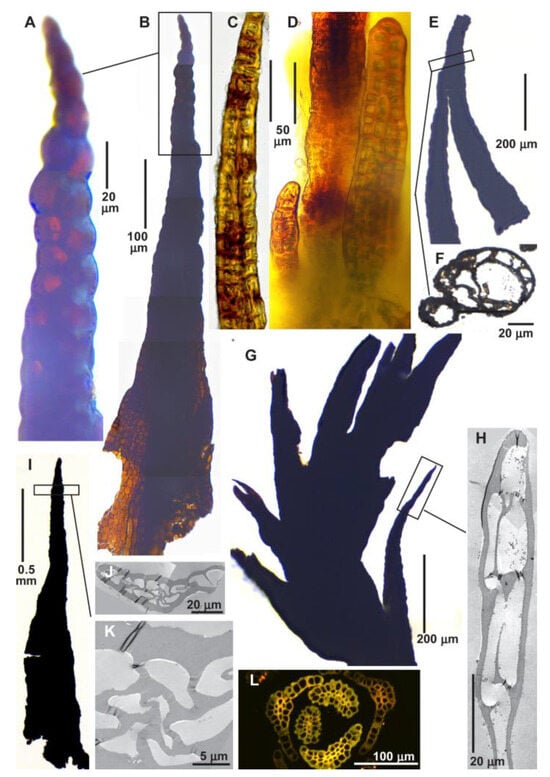 Our attempts to make cross-sections of Protosphagnum leaves revealed that anatomical studies of these fossil mosses are challenging. The delicate bodies of these plants, when sectioned at 2 µm from a resin block, appear to lack any discernible structure (Figure 3A–C). The cell contents in the TEM images appear almost homogeneous, with cell boundaries rarely visible and uncertain at best. The walls of hyaline cells in Protosphagnum are thinner than half a micron. Figure 3 presents several images of these sections. Under a light microscope, hyaline cells can be seen with fibril-like structures across them (Figure 3K), which are actually the cell walls, with approximately 2 μm spacing at points where they appear as a double line (i.e., where they join the dorsal and ventral surfaces of the hyaline cell). The costa ‘section’ fragment in Figure 3I (arrowed) shows its unistratosity, an unusual structure in mosses.