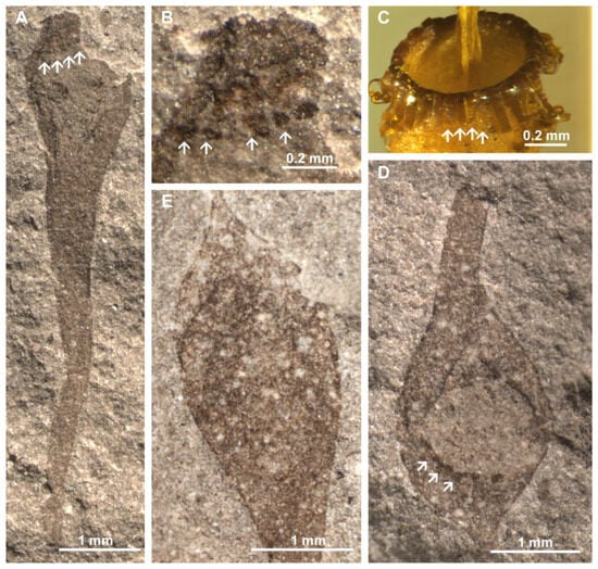 In addition to new Aristovo collections, the present paper includes new images of Permian collections of Rhizinigerites previously published in [,] from Viled (deposited in the Geological Institute of Russian Academy of Science (GIN RAS)), collections of Polyssaievia published in [] from various localities (listed in the captions of its illustrations), deposited in GIN RAS, and collections of Kulindobryum published in [] from the Middle Jurassic of Transbaikalia (deposited in the Borissyak Paleontological Institute of Russian Academy of Science (PIN RAS)).