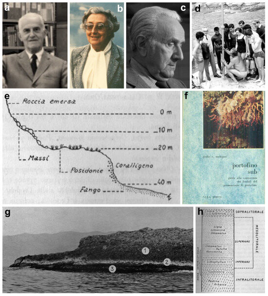Marine biology, the beginnings. (a,b) Two pioneers of marine biology research on the Portofino Promontory: Enrico Tortonese (a), director of the Giacomo Doria Natural History Museum in Genoa from 1955 to 1976, and Lucia Rossi (b), professor of zoology at the University of Turin; (c) Duilio Marcante, pioneer of scuba diving; (d) Marcante (crouched) and Tortonese (second from left) with a group of divers on a Camogli dock; (e) the first zonation scheme of benthic communities along a vertical transect in Cala Dell’Oro [24]; (f) the first Italian diving guide regarding Portofino published by Giulio Melegari in 1973; (g,h) photograph of Punta Chiappa with the main shallow-water biocenoses (1, supralittoral; 2, upper midlittoral; 3 lower midlittoral); (g) and zonation scheme (h) (from [24]).