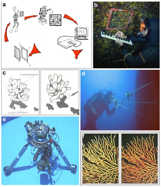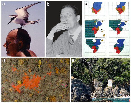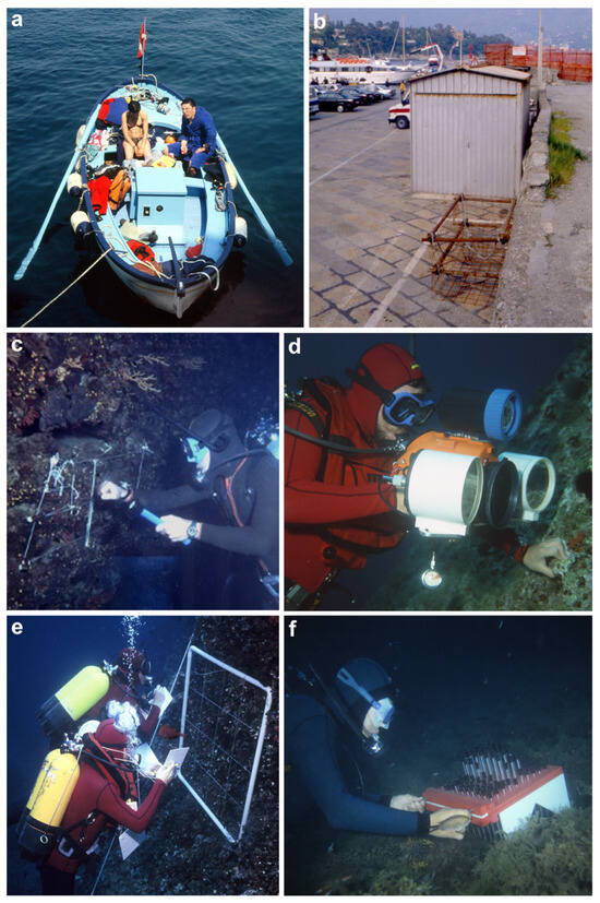 In 1964, Michele Sarà became director of the Zoology Institute of the University of Genoa (Figure 4a) and began working on the sponges of the shallow caves of the Ligurian coast, some of which were in the Portofino area [35]. Previously, in 1958, Sarà [36] had investigated the sponges of the promontory, studying an extensive collection provided by Tortonese. At the time, the sponges of Liguria were virtually unknown: 41 species were listed in 1958, of which two were new to science. Around the same time, Sarà began to take on the issue of the temporal evolution of the community of sponges. With the assistance of Gustavo Pulitzer-Finali (Figure 4b), he spent over a year mapping some groups of encrusting sponges, tracing their outlines with a pencil through a piece of transparent plexiglass (Figure 4c,d). This work was performed on the walls of the Cala dell’Olivetta, on the northern part of Punta del Faro (Figure 4e). Marine biologists’ interest in this small bay is borne witness to by the book by Baron von Mümm [1], who described it as a treasure chest for researchers.