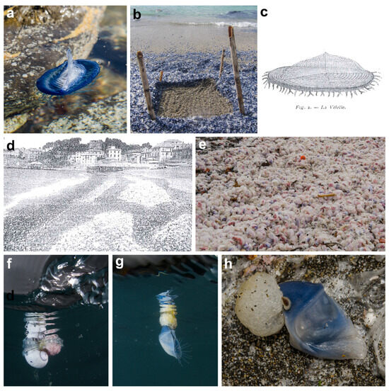 Pleustonic organisms. (a) A colony of the pleustonic hydrozoan Velella velella, known as by-the-wind sailor, photographed in front of the Portofino coast; (b) seasonal mass stranding of V. velella along the coast of Santa Margherita Ligure; (c) drawing of a colony of V. velella (from [92]); (d) photograph of a huge stranding, along Sturla beach, occurred in 1923 (from [92]); (e) tens of thousands of specimens of the pleustonic gastropod Janthina pallida stranded on the Sturla beach in 2017; (f) a specimen of J. pallida and (g) the rare Atlantic goose barnacle Dosima fascicularis pictured in the port of Bogliasco and (h) in the 2017 stranding.