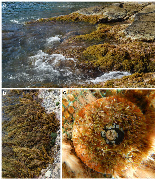 Algal reforestation. (a) An algal fringe dominated by Ericaria amentacea; (b) a close-up view of the algae; (c) one of the terracotta supports with young propagules used for the restoration.