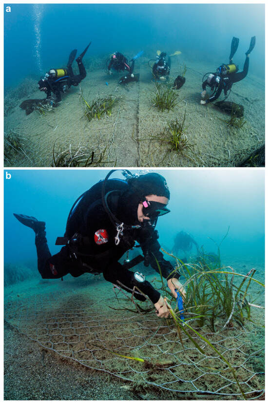 Posidonia oceanica reforestation. (a) Reforestation activities of the Posidonia oceanica meadow in Punta Pedale; (b) anchoring the cuttings to the biomattes.