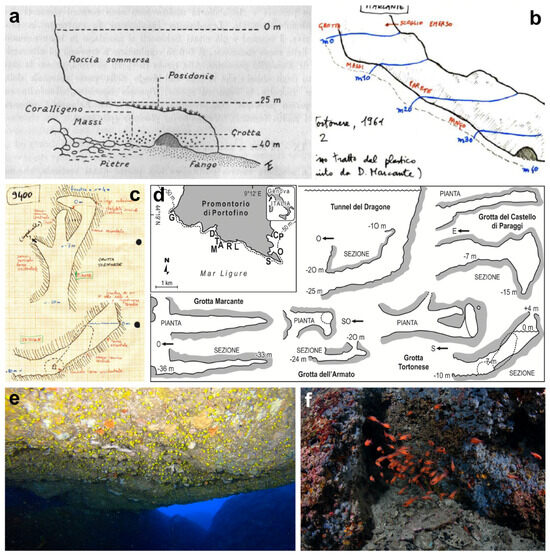 Caves. (a) Diagram of a portion of Punta Carega with the Marcante Cave [24]; (b) profile of the Marcante Cave from [25] re–drawn by Carlo Nike Bianchi; (c) survey carried out by Carlo Nike Bianchi of the Tortonese Cave; (d) location of the main marine caves of the Portofino Promontory, and diagrams of some of them (from [174]); (e) the Dragone Tunnel and some typical sciaphilic organisms, such as the scleractinians Leptopsammia pruvoti and Madracis pharensis, and (f) the cardinal fish Apogon imberbis.