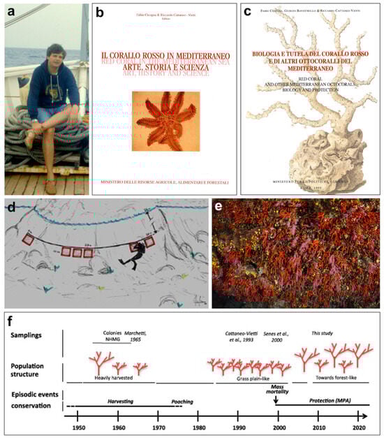 Coralligenous reefs: past and present. (a) Coralligenous shelf from the Altare dive spot at 35 m; (b) Marco Bertolino and Giorgio Bavestrello sampling coralligenous blocks for the study of paleospicules; (c) core of the coralligenous bioconstruction; (d) diagram of the sediment trap used to study the detritus rolling down along the Paraggi coralligenous cliff (from [183]; (e) Giorgio Bavestrello during the installation of the traps.
