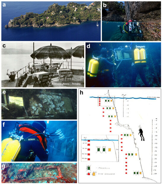 Thanks to his partnership with the SCUBA divers, Tortonese [24,25] described the initial fundamentals of the bionomy of the promontory’s seabed and published the first vertical transect of Cala dell’Oro and Punta Carega, mapped directly during the dives (Figure 3e,g,h). In 1959, Cino Motta [26] published the first underwater sketch of the Punta del Faro reef. Rossi’s research [27,28,29] concentrated primarily on cnidarians. Recreational divers’ interest in Portofino was definitively consecrated by the foundation in 1954 of the Centro Subacqueo Mediterraneo di Nervi, a diving centre founded on the initiative of Marcante, and the first Italian diving guide, Portofino Sub, published by Giulio Melegari [30] (Figure 3f).