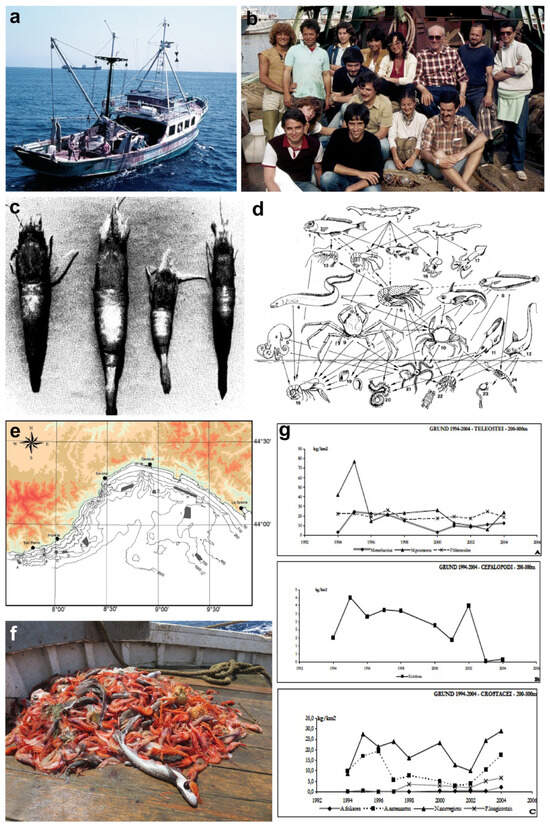 - Relini, G.; Palandri, G.; Relini, M.; Garibaldi, F.; Torchia, G.; Cima, C.; Bellingeri, M. Pesca sperimentale del rossetto in Liguria. Biol. Mar. Mediterr. 1998, 5, 487–502. [Google Scholar]