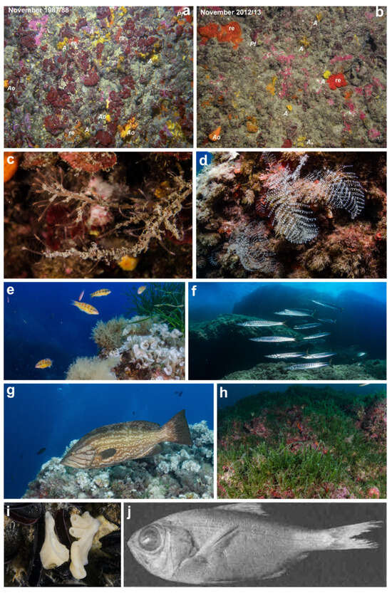 Vertical transects like those already performed, following Tortonese instructions, by the divers of the Centro Subacqueo di Nervi in the 1950s, were repeated between 1991 and 1993 [101,102] and between 2008 and 2013 [103], and continue to be performed today to carry forward this important, and extremely rare, historical set of information. Initially, the communities proved to be similar to those described over thirty years before. Yet, species that Tortonese had not found were later reported as common, such as Pseudochlorodesmis furcellata and Zanardinia typus. On the contrary, some previously abundant species disappeared, for example, the sponge C. nicaeensis and the bivalve Spondylus gaederopus. The disappearance of the latter was probably due to disease [104], while no explanation was found for the disappearance of the sponge [102], which was still present in the late 1970s elsewhere in the region [105].