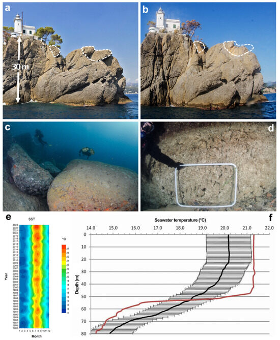 The coastal marine area off the Promontory of Portofino was added to the LTER—International Long Term Ecological Research network in 2007 (Marine Area of Portofino Promontory—LTER Code: LTER EU IT 015) [66] thanks to numerous successive studies in the region since the 1980s, and in particular, since 1999, when the systematic gathering of the main physical and chemical–biological variables along the water column, and of the main weather/climate drivers, began. This site’s extensive set of physical, chemical, and biological data represents a powerful tool for reconstructing the seasonal cycles and differentiating regular and recurring models from occasional and exceptional events [67]. Data analysis highlighted an increase in the average temperature along the water column in recent years compared to the decade 1985–1995 and, in particular, a progressive increase in surface temperature in spring and autumn, leading to an extension of the warm period.