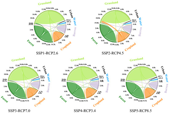 Chord diagram of land-use transitions in southwest China in 2050 under different Shared Socioeconomic Pathways (SSPs) and Representative Concentration Pathways (RCPs).