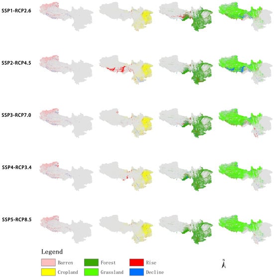 The spatial distribution of land-use changes (Figure 3) reveals notable similarities across the five SSP–RCP scenarios. Barren and grassland areas are predominantly located in Tibet, with 93,824 km2 of grassland projected to convert to cropland under the SSP2-RCP4.5 scenario. Forest cover is most extensive in Yunnan, where forests constitute the dominant land type. Cropland is primarily concentrated in the eastern regions, such as Guizhou and Chongqing, and under the SSP2-RCP4.5 scenario, a significant portion of other land types is expected to convert to cropland.