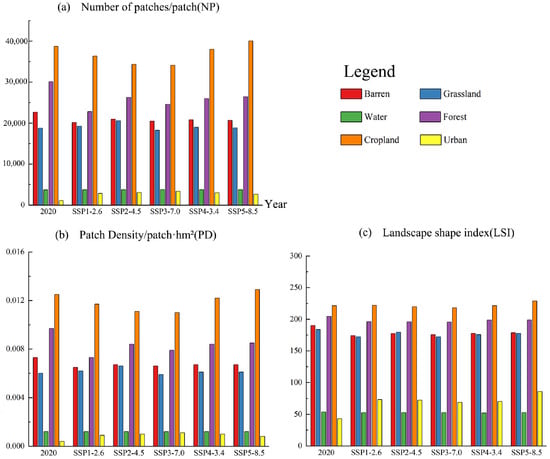 Under the SSP5-8.5 scenario (Table 5), the number of patches (NP) and patch density (PD) of cropland increased from 38,744 and 0.0125 in 2020 to 40,064 and 0.0129, respectively. This increase can be attributed to rapid urban expansion under the SSP5 scenario, which has led to the conversion of cropland and grassland into urban areas. Consequently, this conversion has resulted in a higher number of landscape patches in cropland, increased land-use fragmentation, and greater spatial heterogeneity. In the multiscenario simulations, the LSI of grassland decreased, indicating a trend toward simpler landscape structures and more homogeneous vegetation types. Additionally, the NP, PD, and LSI of urban areas increased, reflecting the ongoing trend of urban expansion in China.