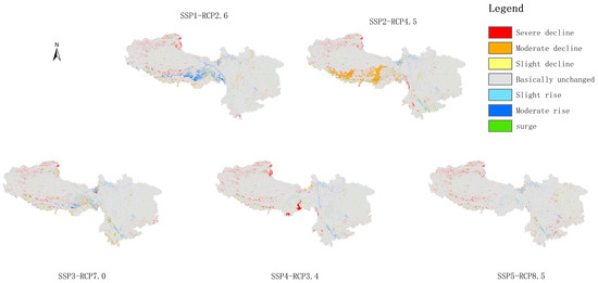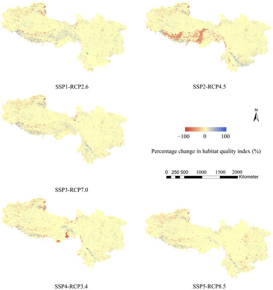 In terms of temporal patterns (Figure 6), the scenarios SSP1-RCP2.6, SSP3-RCP7.0, and SSP5-RCP8.5 exhibited more stable changes in habitat quality, with the spatial distribution of changes being more dispersed. Conversely, under the SSP2-RCP4.5 scenario, the Tibet region experienced the most significant alterations in habitat quality, with a substantial area undergoing a decline.