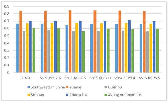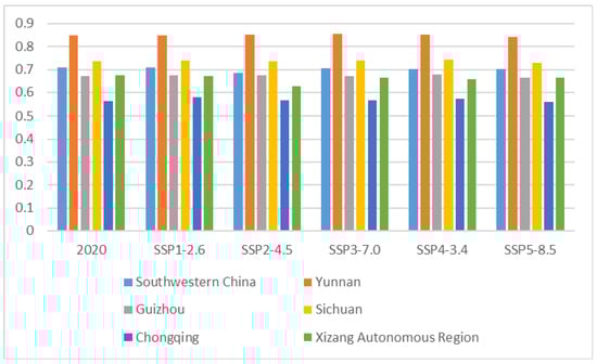 The mean value of the habitat quality index in southwest China decreased under all five scenarios (Figure 7). Compared to the habitat quality index in 2020, the most significant decline occurred under the SSP2-RCP4.5 scenario, with the Tibet Autonomous Region experiencing the largest reduction of 0.04664 in its habitat quality index. Notably, Yunnan Province recorded the highest mean habitat quality index, while Chongqing exhibited the lowest average habitat quality index at 0.55972 under the SSP5-RCP8.5 scenario. In the future land-use multiscenario simulation, both Yunnan and Sichuan maintained average habitat quality indices higher than the regional average, indicating that these provinces exhibited the best habitat integrity in southwest China.
