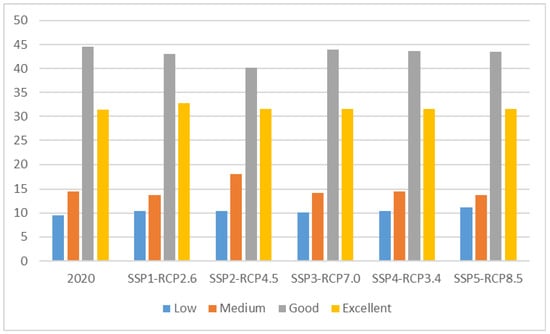 Proportional chart of the habitat quality classification under different SSP–RCP scenarios in southwest China.