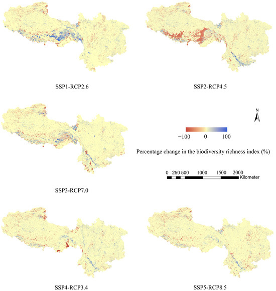 The percentage change in the biodiversity richness index in southwestern China by 2050 under different Shared Socioeconomic Pathways (SSPs) and Representative Concentration Pathways (RCPs).