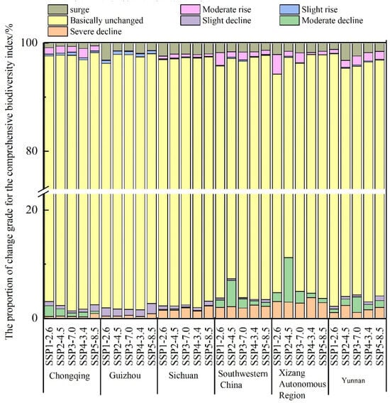 Percentage of areas with different levels of changes in the comprehensive biodiversity index in southwest China and each province in 2050 under different SSP–RCP scenarios.