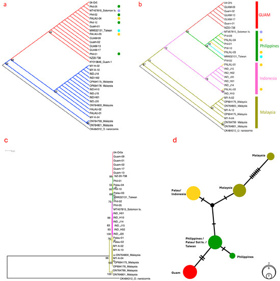 CRB samples collected between 2019 and 2022 were sourced from Guam, Palau, Indonesia, Malaysia, and Philippines (Table 1; Figure S1). The gut of each specimen was dissected, preserved in 100% ethanol, and stored at −20 °C until needed for DNA extraction. Additionally, a historic specimen collected from Guam (04-Or5; circa 2014) was used as a reference to enable matching of more recently collected CRB individuals from Guam that classed within the CRB-G (clade I) haplotype grouping sensu Marshall et al. [35]. A related Oryctes nasicornis mitogenome (GenBank OK484312; [44]) was included to provide comparison of inter-specific nucleotide distance with CRB. Nucleotide positions followed annotation of MT457815 [45].