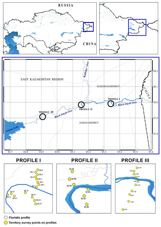 To assess the current state of the vegetation cover in the Black Irtysh River valley, geobotanical profiles were selected. Three profiles were laid out across the valley of the Black Irtysh River (Figure 1).