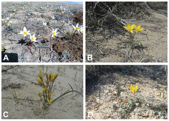 Rare species of early spring flora found in Black Irtysh valley: Tulipa patens C.Agardh ex Schult. Schult. (A), Tulipa uniflora (L.) Besser Backer (B), Gagea fedschenkoana Pasche (C), Tulipa altaica Pall.ex Spreng. (D).