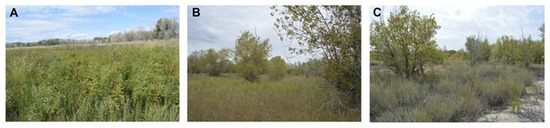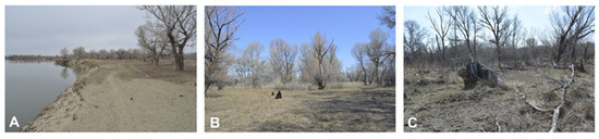 The Irtysh River’s extensive floodplain hosts a variety of ecosystems and plant communities that reflect the botanical–geographical zones it traverses. In the upper reaches, the river flows through the mountainous regions of East Kazakhstan, where alpine and subalpine vegetation dominate [7,8]. As the Irtysh River descends into the lower altitudes, the vegetation transitions into forest–steppe and steppe zones, typical of the Pavlodar region. Here, the floodplain is dominated by a mix of deciduous forests (dominated by plant species belonging to the Salicaceae and Betulaceae families [9]) and grasslands and various grasses and herbs adapted to the more temperate conditions [10]. These regions are vital for biodiversity conservation, providing habitats for numerous plant and animal species [11]. Moreover, the Irtysh River floodplain plays a crucial role in the hydrological and ecological dynamics of the region. The river’s regulation by the neighboring countries has significant implications for water management and ecological sustainability. For instance, the construction of reservoirs and hydroelectric power stations along the river affects the natural flow regimes, sediment transport, and nutrient cycling, which in turn influence the structure and function of floodplain ecosystems [12].