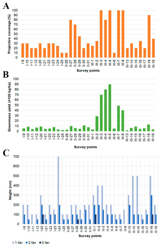 Community parameters: projective coverage at surveyed points (A), green mass yield (B), and estimated height of vegetation cover (C).