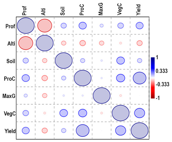 Correlations of the main factors and conditions of the habitat with the vegetation cover of the territory. Prof: profile; Alti: altitude; Soil: type of soil; ProC: projective coverage; MaxG: max grass layering; VegC: vegetation condition; and Yield: expected yield. Cells with significance at p < 0.05 are highlighted. The directions of correlations are denoted in color scale on the right, with red indicating negative and blue indicating positive.