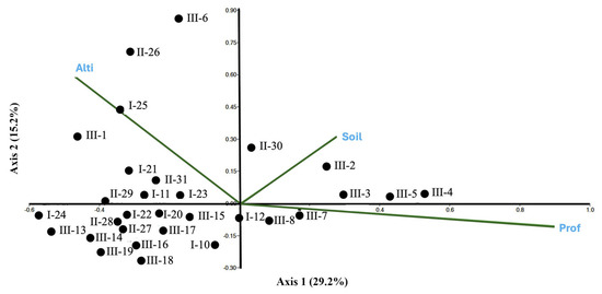 Canonical correspondence analysis showed a high similarity between points III-1, I-25, and II-26 in relation to altitude above sea level, as well as a high similarity between III-2, III-3, III-5 and III-4 in terms of soil cover (Figure 6).